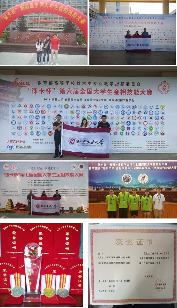 本专业实现本科专业人才的精细化培养,实行“1+1”导师制,系统培养每位学生的实践动手能力,充分为学生提供各类实践科研创新平台。通过国家级创新训练项目、创业训练项目和创业实践项目三类大学生创新创业训练计划,以及参与教师所承担的科研项目,培养了学生静心专注的新时代“工匠精神”。在全国大学生金相技能大赛、中国大学生材料热处理创新大赛、大学生新材料创新设计大赛、全国大学生材料综合技能大赛、北京市大学生科学研究与创业行动计划项目等多项专业赛事及科技活动中,学生参与率达到60%以上。在各级赛事中多次获奖,特别是全国大学生金相技能大赛中,材料学子已连续参加7届,共获得莱卡特别奖1人次,个人一等奖4人次、二等奖5人次,三等奖10人次,团体特等奖(第二名)1次、团体三等奖1次。